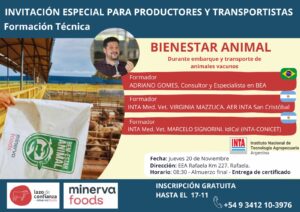 Una nueva jornada de formación técnica en bienestar animal se realizará en Rafaela, en una actividad conjunta entre el INTA y la empresa Minerva Foods. El encuentro, dirigido a productores ganaderos y transportistas, tendrá lugar en la Agencia de Extensión Rural de la EEA Rafaela, ubicada en el kilómetro 227 de la ruta nacional 34.